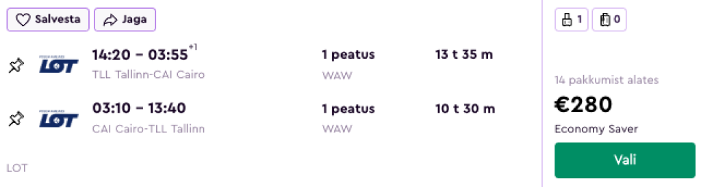 LOT pakub hetkel hea hinnaga lennupileteid Egiptusesse. Ühe kiire ümberistumisega lennupiletid Tallinnast Kairosse on saadaval alates 280€ eest.
