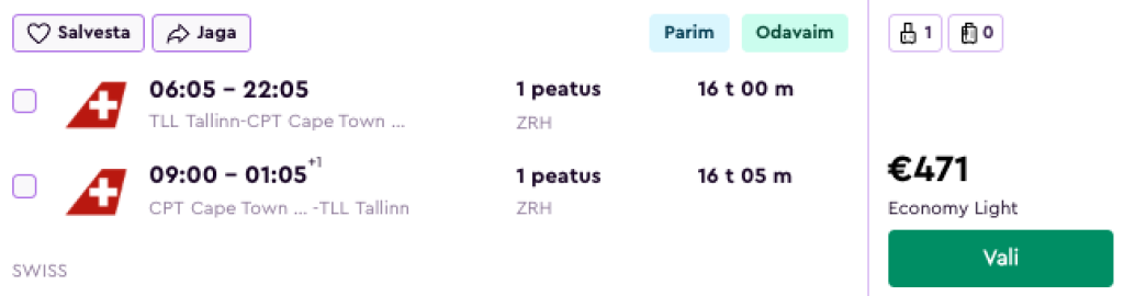 SWISS koostöös Lufthansaga pakuvad hetkel suurepärase hinnaga lennupileteid Lõuna-Aafrika Vabariiki. Mugavate ümberistumistega lennupiletid Tallinnast Kaplinna on saadaval alates 471€ eest.
