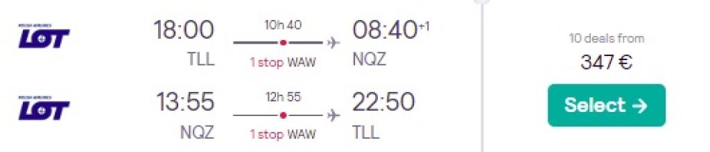 LOT pakub väga hea hinnaga lennupileteid Kasahstani. Edasi-tagasi lennupiletid Tallinnast pealinna Nur-Sultani on saadaval alates 347€ eest. Lennud on ühe ümberistumisega Varssavis. Soodsa hinnaga lennukuupäevi on saadaval alates oktoobrist (sh ka aastavahetuseks). Lennupiletiteni jõudmiseks kliki allolevatel lennukuupäevadel või sisesta leitud kuupäevad Skyscanneri. Kui soovid piletid osta otse lennufirmalt, siis sisesta soovitud kuupäevad LOT.com.