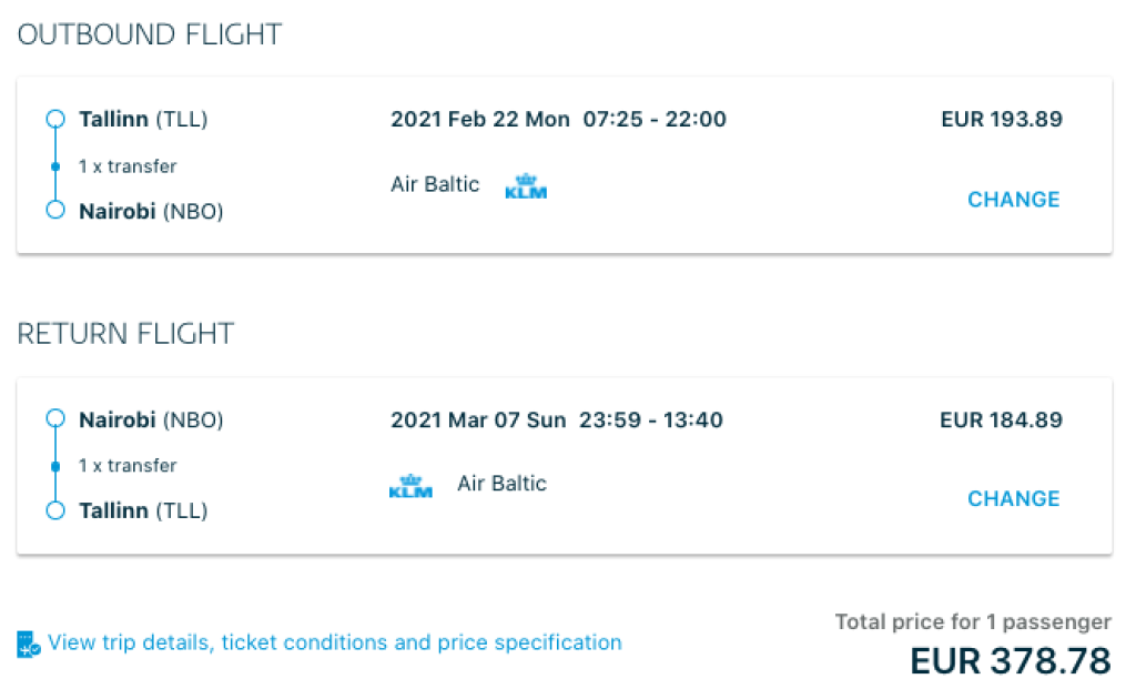 KLM koostöös airBalticuga pakuvad hetkel väga hea hinnaga lennupileteid kevadeks ja sügiseks Tallinnast Keeniasse. Edasi-tagasi lennupiletid Tallinnast Nairobisse on saadaval alates 379€ eest ning lennupiletite hinna sees on ka äraantav pagas. Soodsa hinnaga lennupileteid leiab alates veebruari algusest kuni juunini ning ka septembris-oktoobris.