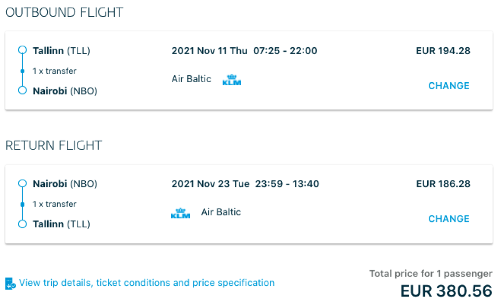 KLM koostöös airBalticuga pakuvad hetkel hea hinnaga lennupileteid kevadeks ja sügiseks Tallinnast Keeniasse. Edasi-tagasi lennupiletid Tallinnast Nairobisse on saadaval alates 374€ eest ning lennupiletite hinna sees on ka äraantav pagas. Soodsa hinnaga lennupileteid leiab mais-juunis ning septembrist detsembri alguseni.