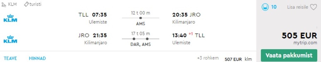 KLM pakub hetkel väga hea hinnaga lennupileteid Tallinnast Kilimanjarosse. Edasi-tagasi lennupiletid on saadaval 505€ eest ning saadaval on ohtralt lennukuupäevi septembrist aprillini . Piletiteni jõudmiseks kliki allolevatel näidiskuupäevadel või kontrolli endale sobivaid kuupäevi läbi [momondo.ee](https://tc.tradetracker.net/?c=23368&m=12&a=258453)Loe ka: Kilimanjarole plaanitakse köisraudteed