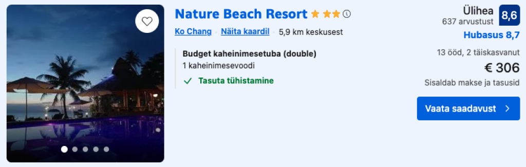 Klikkides Booking.com ning broneerides sealtkaudu oma majutuse Koh Chang saarel või mujal Tais, toetate te Trip.ee lendude sooduspakkumiste rubriiki.