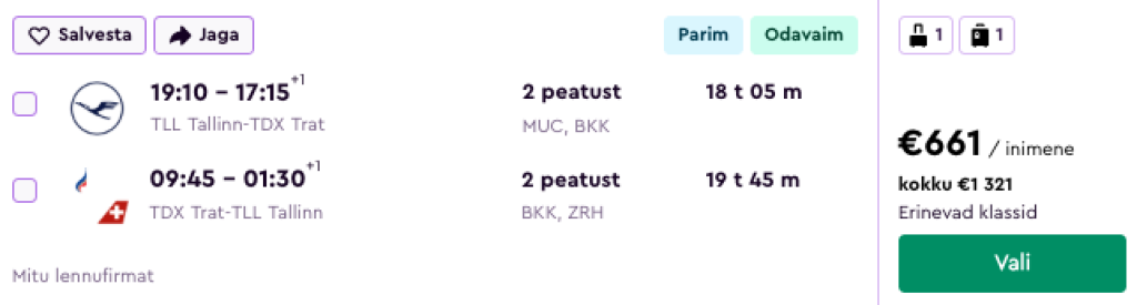 Toome allpool välja näidispakkumise, kuidas iseseisvalt broneerides nii Lufthansa lennupiletid Tallinnast koos äraantava pagasi kui majutuse suurepäraste reitingutega rannaäärses 3* hotellis Koh Changi saarel (13 ööd), saab kahenädalase puhkusereisi kahele Taisse kätte alates 816€ eest/inimene.