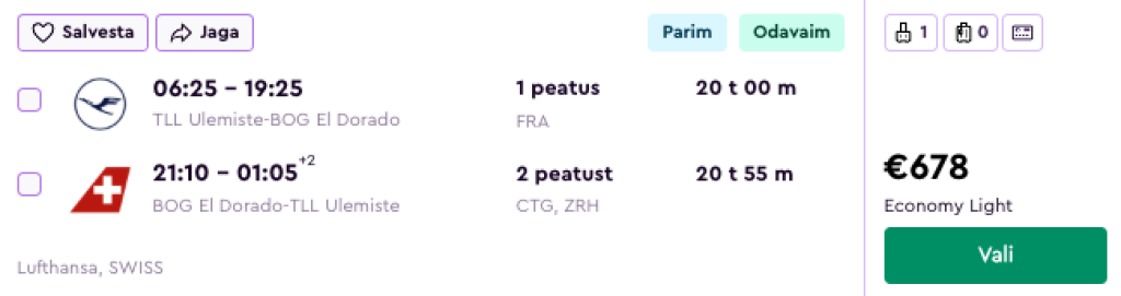 Lufthansa koostöös SWISSiga pakuvad hetkel suurepärase hinnaga lennupileteid Kolumbiasse. Kiirete ümberistumisega edasi-tagasi lennupiletid Tallinnast Bogotasse on saadaval alates 678€ eest ja ümberistumised toimuvad Frankfurdis või Zürichis.