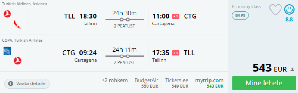 Turkish Airlines pakub lennupileteid Tallinnast Kolumbiasse Cartagenasse hinnaga alates 543€. Lennud toimuvad üle Istanbuli ja Bogota või Panama City. Mainitud linnadest lendavad Cartagenasse vastavalt Avianca ja COPA. Saadavust on alates märtsist 2018.