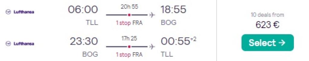 Lufthansa pakub hetkel väga hea hinnaga lennupileteid Kolumbiasse. Ühe ümberistumisega edasi-tagasi lennupiletid Tallinnast Bogotasse on saadaval alates 623€ eest ning hea hinnaga lennupileteid leiab aprillist juunini. Lennupiletite ostmiseks kliki allpool olevatel näidiskuupäevadel või sisesta need Skyscannerisse. Meie soovitus on minna Lufthansa.com ja osta lennupiletid otse lennufirmalt.