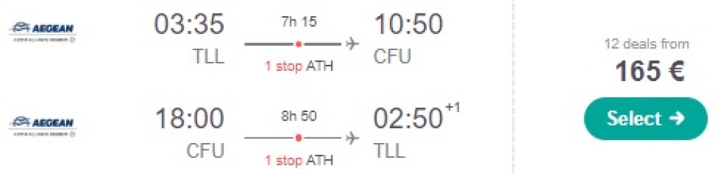 Aegean Airlines pakub hea hinnaga lennupileteid Tallinnast Korfule. Edasi-tagasi lennupiletid on saadaval alates 165€ eest. Soodsa hinnaga lennupileteid leiab mais-juunis. Piletiteni jõudmiseks kliki allpool olevatel näidiskuupäevadel või kontrolli endale sobivaid lennukuupäevi läbi Skyscanneri