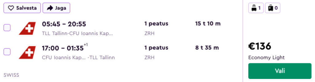 Lufthansaga koostöös SWISSiga pakuvad hetkel suurepärase hinnaga lennupileteid Kreekasse. Edasi-tagasi lennupiletid Tallinnast Korfu saarele on saadaval alates 136€ eest. Miinuseks on tihtipeale minnes pikem ümberistumine kas siis Münchenis või Zürichis, mis annab ka võimaluse emb-kumma linnaga tutvumiseks.