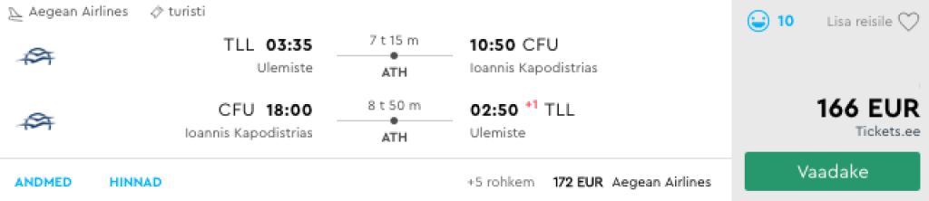 Aegean Airlines pakub hetkel väga hea hinnaga lennupileteid alustamaks suve Korful. Edasi-tagasi lennupiletid Tallinnast Korfule on saadaval 166€ eest ning kiirete ümberistumistega lennupiletite saadavust leiab mais-juunis. Suvel leiab sarnase hinnaga lennupileteid, aga sel juhul on mõlemal suunal tarvis veeta päev Ateenas, mis annab ka võimaluse näiteks Akropolise külastamiseks. Parima hinnaga lennupiletid leiad üles läbi Momondo.ee