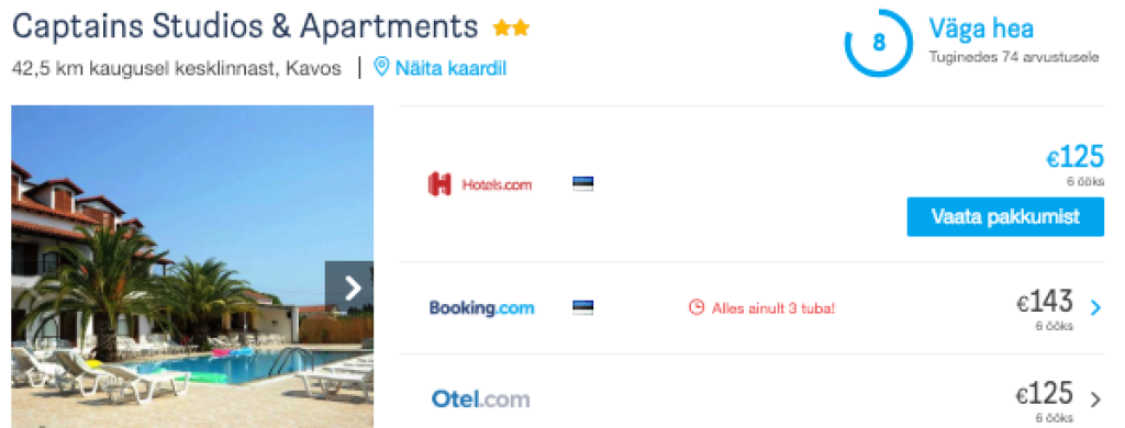 ####Hotellipakkumised KorfulVeeda oktoobris Korful kuuepäevane puhkus. Otsisime välja läbi hotellihindade võrdlusportaali Hotelscombined.ee hea reitingu ning hinnaga hotellisoovituse kuueks ööks. Sobivad lennupiletid vahemikus 18.05-24.05 leiad SIIT.Meie soovitus on:Captains Studios & Apartments - Stuudiokorter kahele väga hea reitinguga hotellis maksab kuueks ööks vaid 125€. Lisainfo ja broneerimine