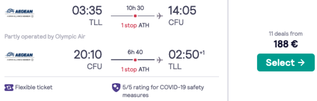 Aegean pakub hetkel hea hinnaga lennupileteid Tallinnast Korfule. Edasi-tagasi lennupiletid on saadaval alates 188€ eest ning soodsa hinnaga lennupileteid leiab oktoobriks. Lendudel on mõlemal suunal üks ümberistumine Ateenas. Piletiteni jõudmiseks kliki allpool olevatel näidiskuupäevadel või kontrolli endale sobivaid lennukuupäevi läbi Skyscanneri