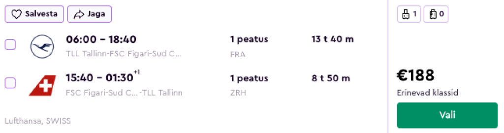 SWISS koostöös Lufthansaga pakuvad hetkel hea hinnaga lennupileteid Prantsusmaale kuuluvale Korsika saarele. Edasi-tagasi lennupiletid Tallinnast Figarisse on saadaval alates 188€ eest. Lendudel on mõlemal suunal üks ümberistumine kas siis Frankfurdis või Zürichis.