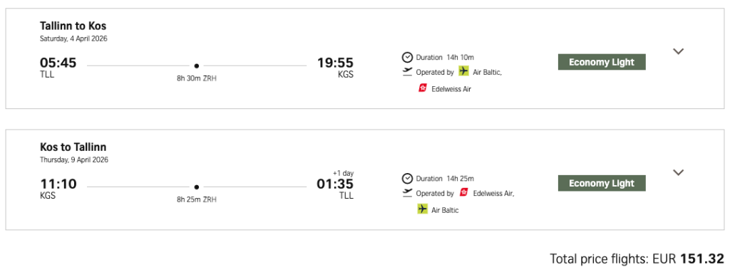 SWISS koostöös Lufthansaga pakuvad hetkel hea hinnaga lennupileteid Kreekasse. Edasi-tagasi lennupiletid Tallinnast Kosi saarele on saadaval alates 151€ eest. Miinuseks on tihtipeale tulenevalt lennuplaanist pikemad ümberistumised päevasel ajal kas siis Frankfurdis või Zürichis.