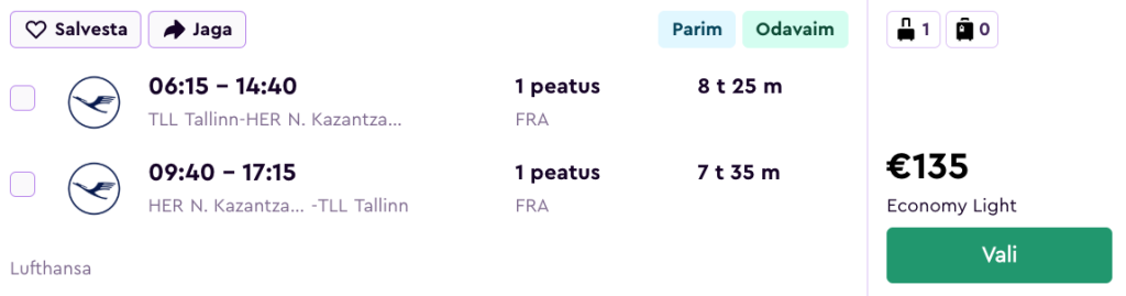 Lufthansa koostöös SWISSiga pakuvad hetkel väga hea hinnaga lennupileteid Kreetale. Soodsaimad edasi-tagasi lennupiletid Tallinnast Iraklio lennujaama on saadaval alates 135€ eest. Kõikidel meie poolt välja otsitud näidiskuupäevadel on kiired ümberistumised.