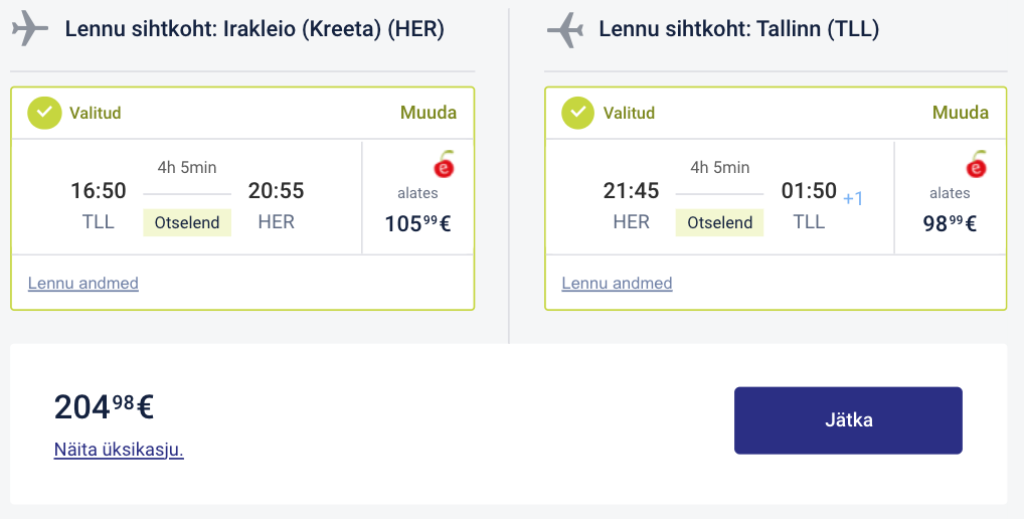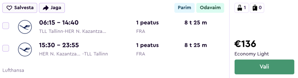 Lufthansa koostöös SWISSiga pakuvad hetkel väga hea hinnaga lennupileteid Kreetale. Soodsaimad edasi-tagasi lennupiletid Tallinnast Iraklio lennujaama on saadaval alates 136€ eest. Kõikidel meie poolt välja otsitud näidiskuupäevadel on kiired ümberistumised. Samuti pakub hetkel airBaltic suveks väga hea hinnaga lennupileteid otselendudele Tallinnast Kreetale. Tõime allpool välja ka näidiskuupäevad.