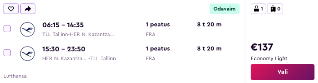 Lufthansa koostöös SWISSiga pakuvad hetkel väga hea hinnaga lennupileteid Kreetale. Soodsaimad edasi-tagasi lennupiletid Tallinnast Iraklio lennujaama on saadaval alates 137€ eest.