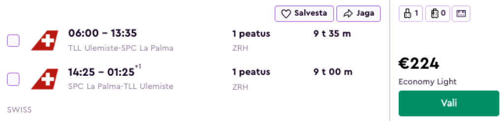 SWISS koostöös Lufthansaga pakuvad hetkel suurepärase hinnaga lennupileteid Kanaaridele. Ühe kiire ümberistumisega edasi-tagasi lennupiletid Tallinnast La Palma saarele on saadaval alates 224€ eest.