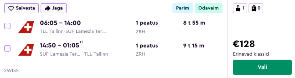 Lufthansa koostöös SWISSiga pakuvad hetkel väga hea hinnaga lennupileteid Itaaliasse. Ühe ümberistumistega edasi-tagasi lennupiletid Tallinnast Calabria piirkonnas asuvasse Lamezia Termesse on saadaval alates 128€ eest.