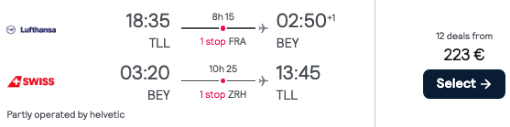 SWISS ja Lufthansa pakuvad hetkel atraktiivse hinnaga lennupileteid Liibanoni. Ühe kiire ümberistumisega edasi-tagasi lennupiletid on saadaval alates 223€ eest ning soodsaid lennupileteid on saadaval kevadel ning sügisel. Toome allpool välja vaid mõned näidiskuupäevad, saadavust leiab ka teistel kuupäevadel. Parima hinanaga lennupiletid leiab üles läbi Skyscanneri.. Kui soovid piletid osta otse lennufirmalt kuskil 20€ võrra kallimalt, siis sisesta soovitud kuupäevad Lufthansa.com.