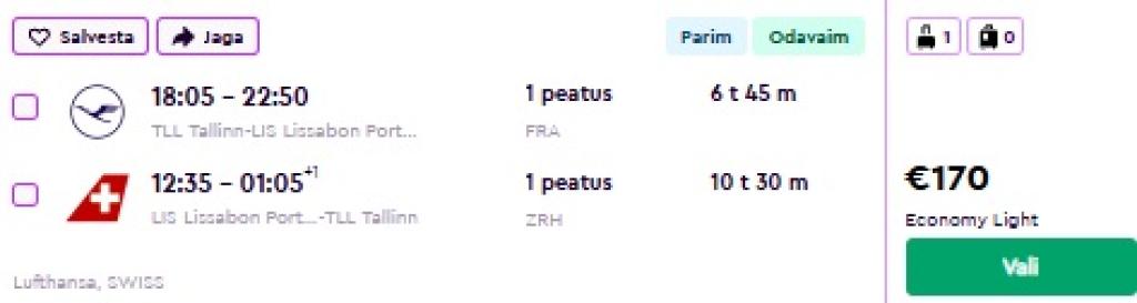 SAS ja ka Lufthansa pakuvad hetkel väga hea hinnaga lennupileteid Portugali. Edasi-tagasi lennupiletid Tallinnast Lissaboni on hetkel saadaval alates 156€ eest. Valikus on ohtralt soodsaid lennukuupäevi kuni aprillini välja.