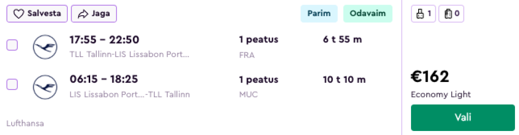 Lufthansa koostöös SWISSiga pakuvad hea hinnaga lennupileteid Portugali. Edasi-tagasi lennupiletid Tallinnast Lissaboni on hetkel saadaval alates 162€ eest.