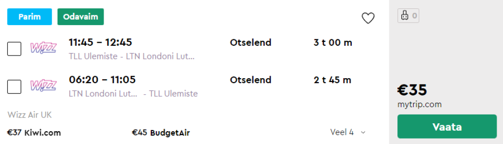 Wizzair pakub hetkel suurepärase hinnaga lennupileteid Suurbritanniasse. Edasi-tagasi lennupiletid otselendudele Tallinnast London Lutoni lennujaama on saadaval alates 35€ eest. Hea hinnaga lennupileteid leiab vahemikus november - detsember, sealhulgas ka jõulud ning aastavahetus! Piletiteni jõudmiseks kliki allpool välja toodud soodsatel näidiskuupäevadel või otsi endale sobivad lennupiletid üles läbi Momondo.ee
