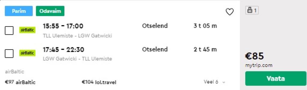 Hetkel leiad väga hea hinnaga lennupiletid airBalticu kampaania raames Londonisse. Edasi-tagasi lennupiletid Tallinnast on saadaval alates 85€ eest ning tegemist on mugavate otselendudega. Soodsa hinnaga lennupileteid leidub oktoobrist kuni aasta lõpuni välja. Parima hinnaga lennupiletid leiad üles läbi momondo.ee, aga meie soovitus on minna airBaltic.com ja broneerida lennupiletid otse lennufirmalt.