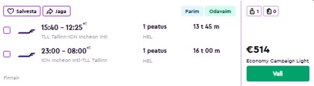 Finnair pakub hetkel kampaaniahinnaga lennupileteid Lõuna-Koreasse. Edasi-tagasi lennupiletid Tallinnast on saadaval vaid 514€ eest.