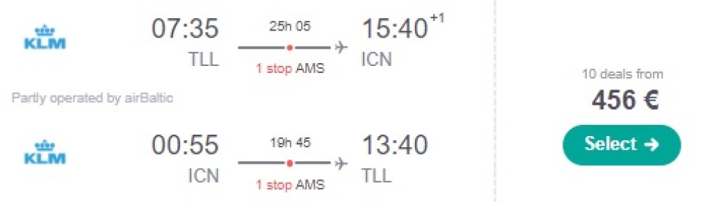 Hetkel leiad hea hinnaga lennupileteid Tallinnast Lõuna-Koreasse, Souli. Edasi-tagasi lennupiletid on saadaval alates 456€ eest ning saadaval on lennukuupäevi novembrist märtsini ning mais-juunis. Piletiteni jõudmiseks kliki allolevatel näidiskuupäevadel või kontrolli endale sobivaid kuupäevi läbi skyscanneri või otse KLM'i kodulehelt.