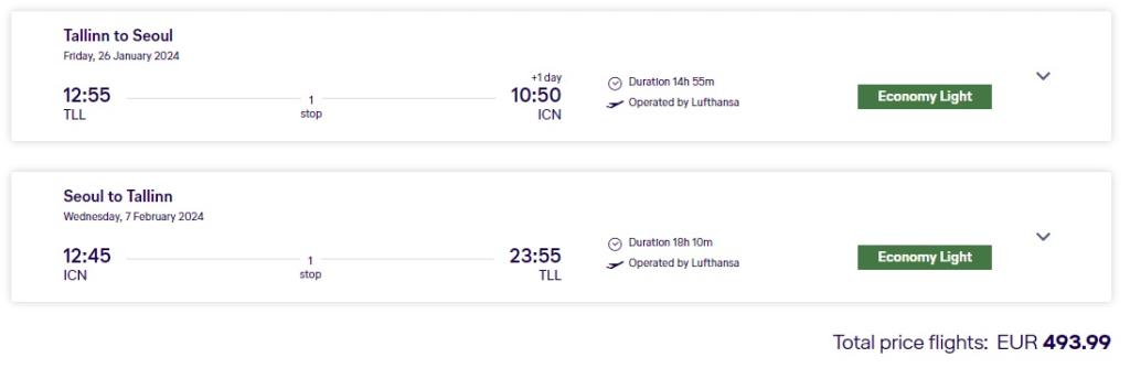 Lufthansa pakub hetkel suurepärase hinnaga lennupileteid Lõuna-Koreasse. Edasi-tagasi lennupiletid Tallinnast Seouli on saadaval alates 494€ eest. Soodsa hinnaga lennupileteid leiab jaanuarist märtsini. Lennud on ühe ümberistumisega mõlemal suunal. Parima hinnaga lennupiletid leiab otse lennufirma kodulehelt Lufthansa.com.