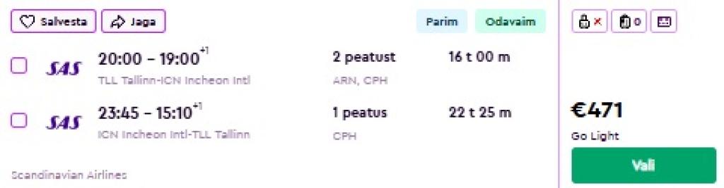 Scandinavian Airlines pakub hetkel väga hea hinnaga lennupileteid Lõuna-Koreasse. Edasi-tagasi lennupiletid Tallinnast Seouli on saadaval alates 471€ eest.