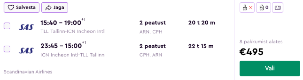 Scandinavian Airlines pakub hetkel väga hea hinnaga lennupileteid Lõuna-Koreasse. Edasi-tagasi lennupiletid Tallinnast Seouli on saadaval alates 495€ eest.