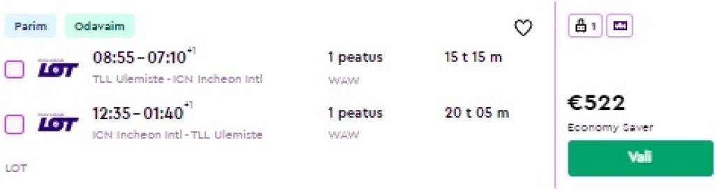 LOT pakub hetkel hea hinnaga lennupileteid Lõuna-Koreasse. Edasi-tagasi lennupiletid Tallinnast Seouli on saadaval alates 522€ eest ning saadaval on ohtralt soodsaid lennukuupäevi oktoobrist märtsini. Lennud on mõlemal suunal ühe ümberistumisega Varssavis. Parima hinnaga lennupiletid leiad üles läbi Momondo.ee, kui aga soovid piletid osta otse lennufirmalt, siis sisesta soovitud lennukuupäevad LOT.com.