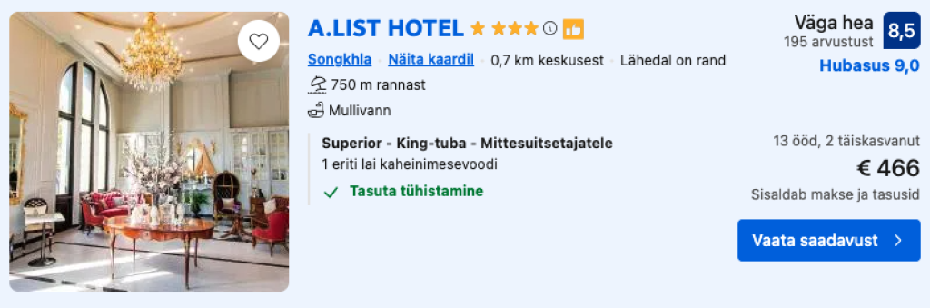 Toome allpool välja pakkumise, kuidas broneerides iseseisvalt eraldi nii Lufthansa lennupiletid koos äraantava pagasiga Tallinnast Hat Yaisse kui majutuse rannalähedases väga heade reitingutega neljatärnihotellis A.LIST HOTEL (13 ööd), saab kahenädalase puhkusreisi Lõuna-Taisse kätte alates 917€ eest/inimene.