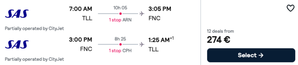 Scandinavian Airlines pakub hetkel väga hea hinnaga lennupileteid Madeirale. Ühe kiire ümberistumisega edasi-tagasi lennupiletid Tallinnast on saadaval alates 274€ eest. Tihtipeale leiab ka mõnevõrra soodsama hinnaga lennupileteid, kus tagasiteel on pikem ümberistumine (tuleb veeta öö) kas siis Stockholmis või Kopenhaagenis.