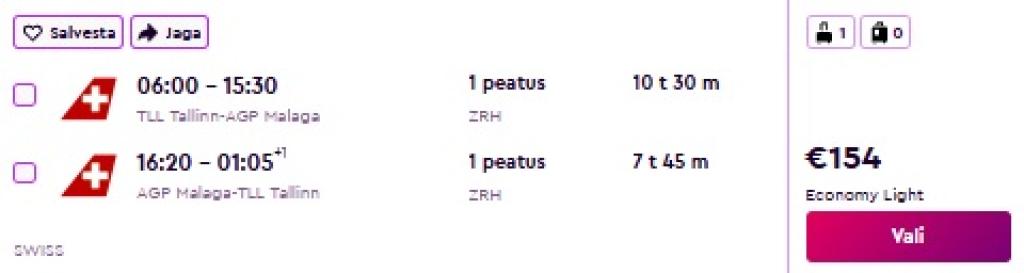 SWISS koostöös Lufthansaga ning ka SAS pakuvad hetkel väga hea hinnaga lennupileteid Andaluusiasse. Ühe ümberistumistega edasi-tagasi lennupiletid Tallinnast Malagasse on saadaval alates 154€ eest.
