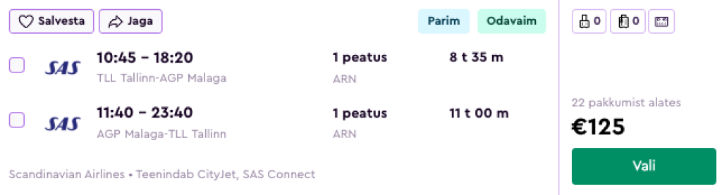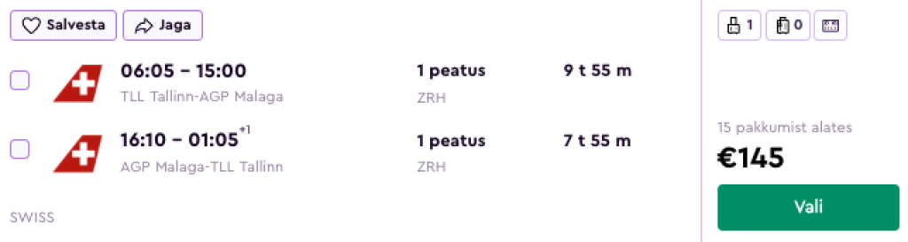 SWISS koostöös Lufthansaga ning ka SAS pakuvad hetkel suurepärase hinnaga lennupileteid Andaluusiasse. Ühe ümberistumisega edasi-tagasi lennupiletid Tallinnast Malagasse on saadaval alates 125€ eest.