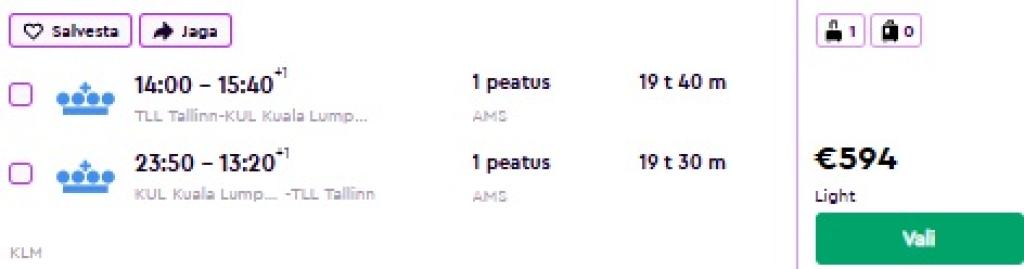 KLM pakub hetkel väga hea hinnaga lennupileteid Malaisiasse. Edasi-tagasi lennupiletid Tallinnast Kuala Lumpurisse on saadaval alates 594€ eest.