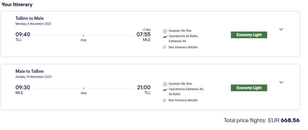 SWISS koostöös Lufthansaga pakuvad hetkel suurepärase hinnaga lennupileteid Maldiividele. Edasi-tagasi lennupiletid algusega Tallinnast on saadaval alates 669€ eest. Mugavate ümberistumistega lennupileteid leiab novembris-detsembris. Lennupiletiteni jõudmiseks kliki allolevatel näidiskuupäevadel ning osta lennupiletid otse SWISS.com kodulehelt.