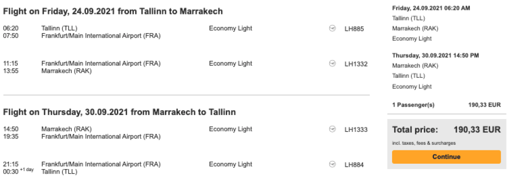 Lufthansa pakub hetkel hea hinnaga lennupileteid Marokosse. Edasi-tagasi lennupiletid Tallinnast Casablancasse ning Marrakechi on saadaval alates 156€ eest. Soodsa hinnaga variante leiab ka alustamaks reisi näiteks Casablancast ning tegemaks tagasilend Marrakechist. Soodsaimad lennupiletid leiab üles läbi Skyscanneri ja kui soovid osta lennupiletid otse lennufirma kodulehelt siis Lufthansa kodulehel on samade lennupiletite hinnaks alates 168€.