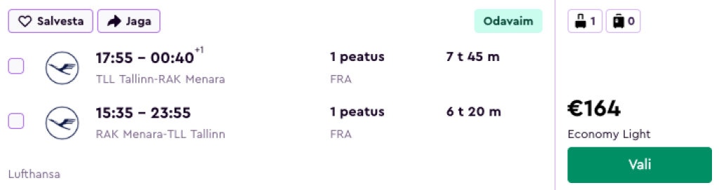 Lufthansa koostöös SWISSiga pakuvad hetkel väga hea hinnaga lennupileteid Marokosse. Kiirete ümberistumistega edasi-tagasi lennupiletid Tallinnast Marrakechi on saadaval alates 164€ eest.