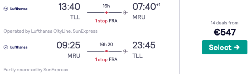 Lufthansa koostöös SunExpressiga pakuvad hetkel väga hea hinnaga lennupileteid Tallinnast Mauritiusele. Edasi-tagasi lennupiletid Tallinnast on saadaval 547€ eest ning lendudel on mõlemal suunal üks kiire ümberistumine Frankfurdis. Lennupiletite hinna sees on nii äraantav pagas kui toitlustamine lennufirmade pardal.
