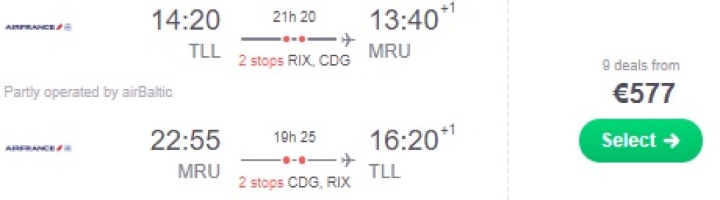 KLM/AF koostöös airBalticu ning Finnairiga pakuvad hetkel väga hea hinnaga lennupileteid talveks Tallinnast Mauritiusele. Soodsaimad edasi-tagasi lennupiletid leiab üles 577€ eest ning hea hinnaga lennupileteid leiab detsembrist kuni 2020. aasta mai lõpuni. Lendudel on mõlemal suunal kaks ümberistumist, Helsingis või Riias ning Pariisis. Lennupiletite hinna sees on nii äraantav pagas kui toitlustamine AF/KLMi pardal. Parima hinnaga lennupiletid leiad üles läbi Skyscanneri või klikkides allolevatel näidiskuupäevadel.