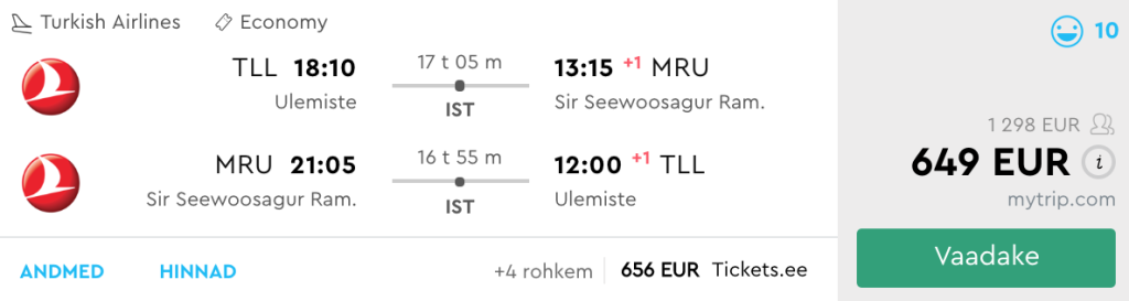 ####LENNUPILETID TALLINNAST MAURITIUSELETallinn-Mauritius-Tallinn alates 649€Toome välja hinna reisides kahekesi. Üksi reisides on lennupileti hind kuskil 5€ võrra kallim. Kõikide meie poolt välja otsitud lennupiletite puhul jäävad hinnad vahemikku 650-690€.