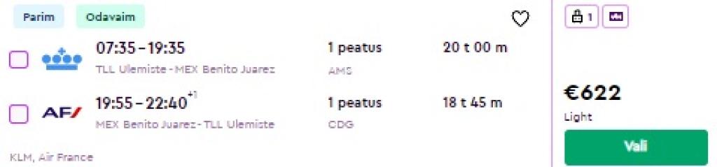 Nii Lufthansa, kui ka KLM/AF pakuvad hetkel soodsa hinnaga lennupileteid Mehhikosse! Edasi-tagasi lennupiletid Tallinnast Mehhiko pealinna Mexico Citysse on saadaval alates 622€ eest ning saadaval soodsad lennupiletid hilissügiseks-talveks. Parima hinnaga lennupiletid leiad üles läbi Momondo.ee või klikkides allolevatel näidiskuupäevadel. Kui soovid piletid osta otse lennufirmalt, siis sisesta kuupäevad vastavalt Lufthansa või KLM'i kodulehele.
