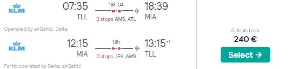 KLM/AF pakuvad hetkel väga hea hinnaga lennupileteid Tallinnast Floridasse. Edasi-tagasi lennupiletite hinnad Miamisse on saadaval alates 240€ eest. Saadavus on suurepärane alates septembrist kuni märtsini välja. Toome allpool vaid näidiskuupäevad, saadavust leiab ka teisteks kuupäevadeks. Parima hinnaga lennupiletid leiad üles läbi Skyscanneri. Kui soovid osta lennupiletid otse lennufirmalt, sisesta alltoodud lennukuupäevad otsingusse KLM'i kodulehel.