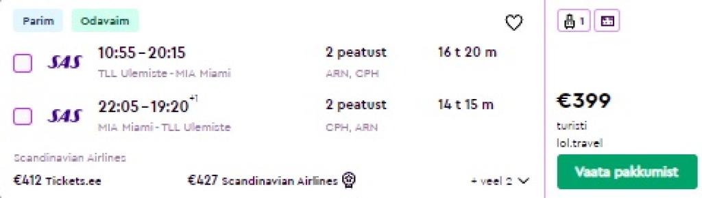 SAS pakub hetkel väga hea hinnaga lennupileteid Floridasse. Edasi-tagasi lennupiletid Tallinnast Miamisse on saadaval alates 399€ eest ning hea hinnaga lennupiletid on saadaval sügisel ja talvel. Lendudel on ümberistumised Stockholmis või Kopenhaagenis. Parima hinnaga lennupiletid leiad üles läbi Momondo.ee.