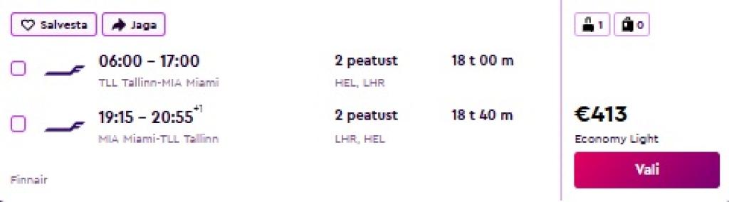 Finnair koostöös British Airways'iga pakuvad hetkel soodsa hinnaga lennupileteid Floridasse. Edasi-tagasi lennupiletid Tallinnast Miamisse on saadaval alates 413€ eest.