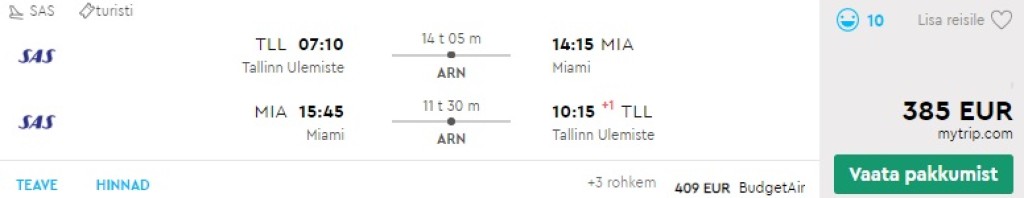 SAS pakub hetkel hea hinnaga lennupileteid Floridasse. Edasi-tagasi lennupiletid Tallinnast Miamisse on saadaval alates 385€ eest ning hea hinnaga lennupileteid leiab sügisel ja talvel. Soodsate lennupiletiteni jõudmiseks kliki allolevatel lennukuupäevadel või kontrolli endale huvipakkuvaid kuupäevi läbi Momondo.ee